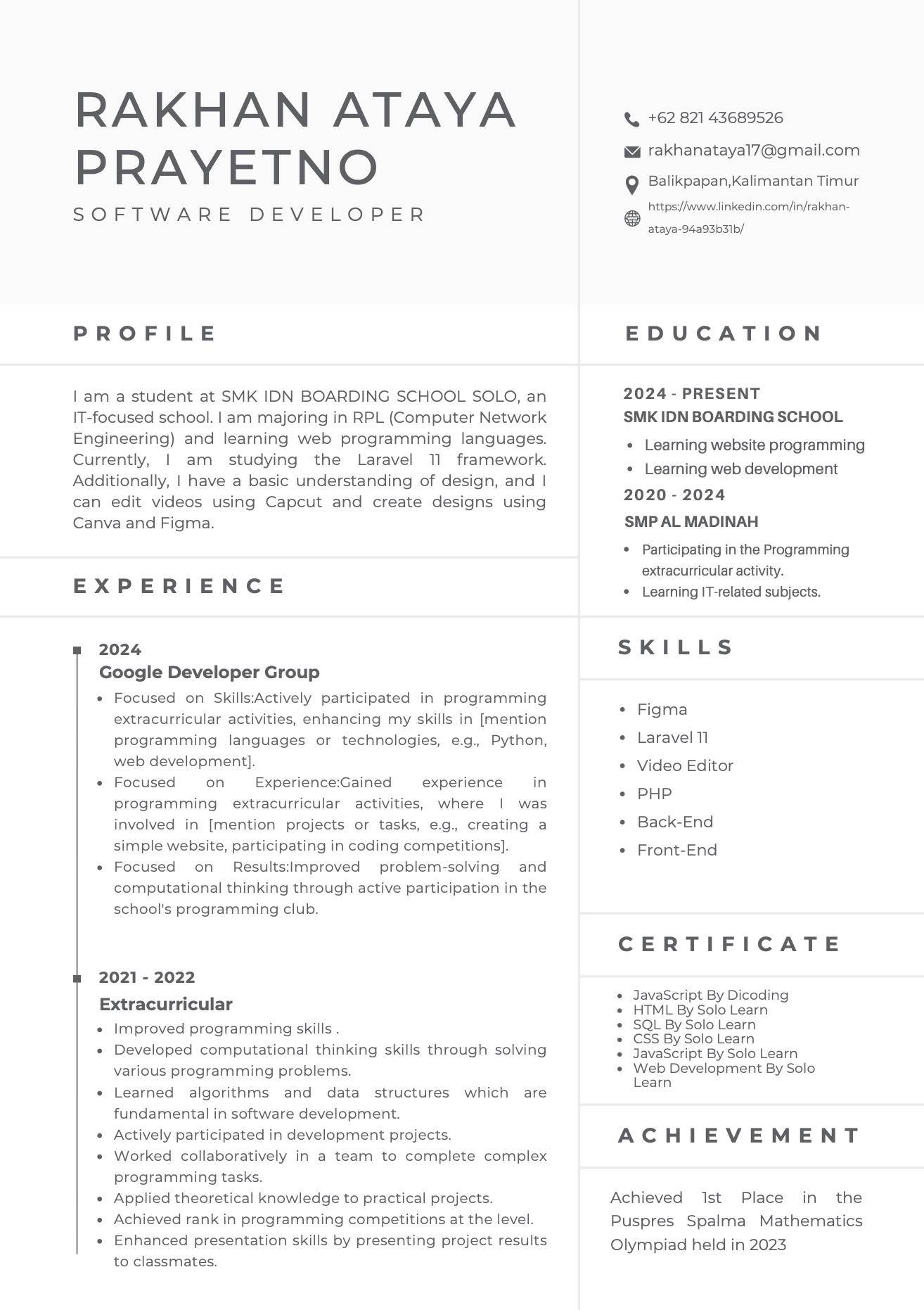 Halo! Saya Rakhan Atay Prayetno, seorang siswa dari IDN Boarding School jurusan Rekayasa Perangkat Lunak (RPL) yang berasal dari Balikpapan, Kalimantan Timur. Saya memiliki minat yang kuat dalam dunia teknologi, khususnya dalam pengembangan web dan pemrograman backend.
